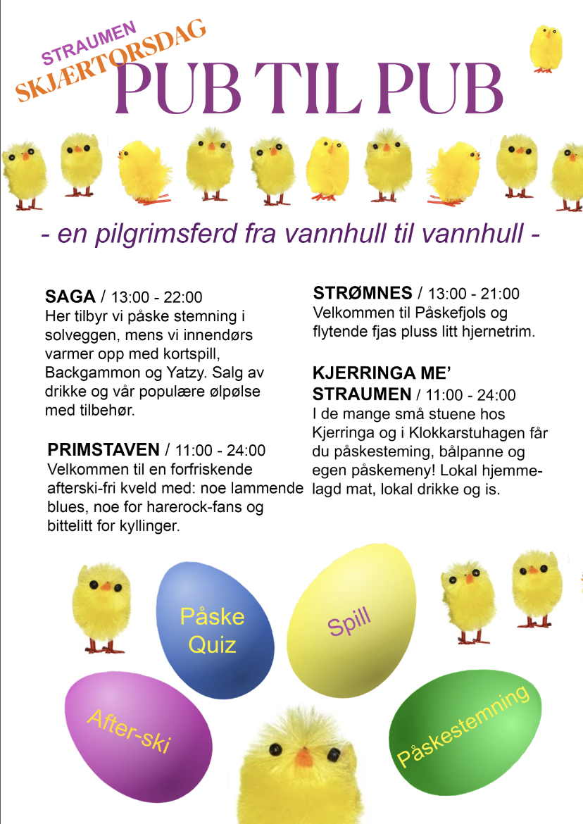 Man gjentar suksessen fra i fjor og ønsker VELKOMMEN til Pub te’ Pub runde på Straumen, Skjærtorsdag.